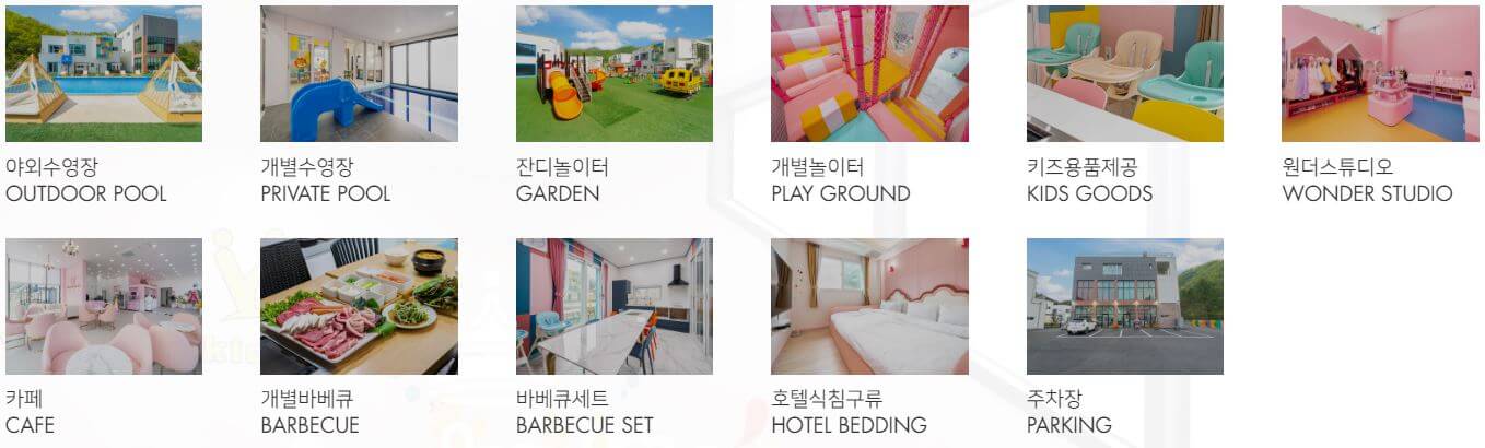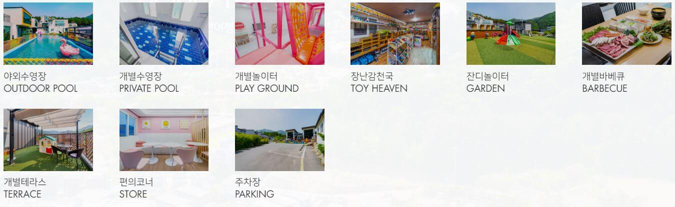 구비시설 : 실내수영장, TV, 냉장고, 전자레인지, 바베큐그릴, 밥솥, 식탁, 하이체어, 화장대, 젖병소독기, 정수기, 식기류일체, 부엌놀이, 와이파이, 드라이기, 수건, 욕실용품(베이비바디워시), 구명조끼 및 튜브 등