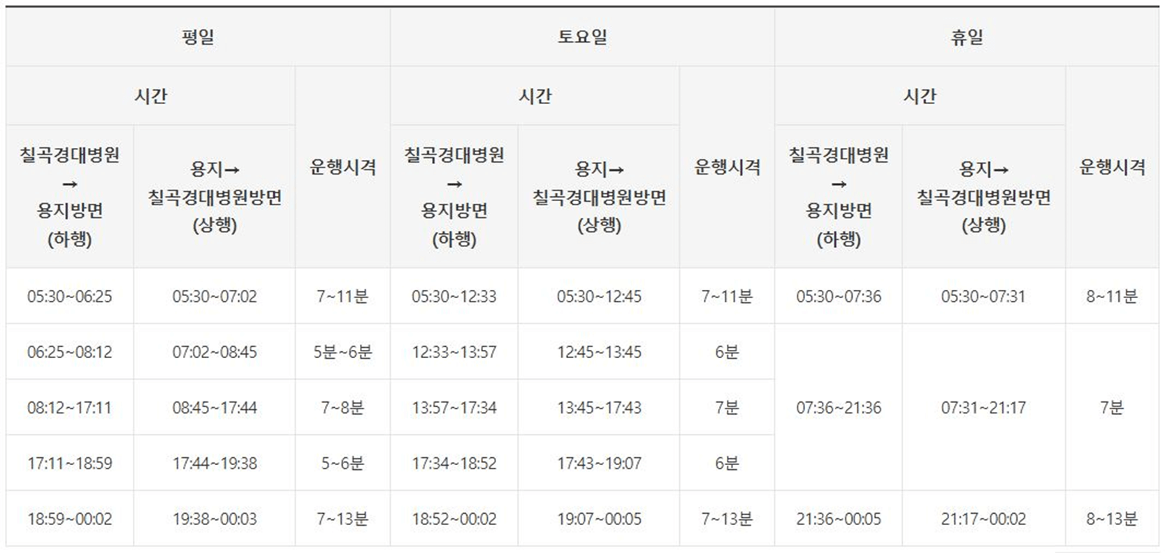 | 칠곡경대병원 | 05:30 | 23:13 | 28 | 31 | 06:18 | 00:05 |