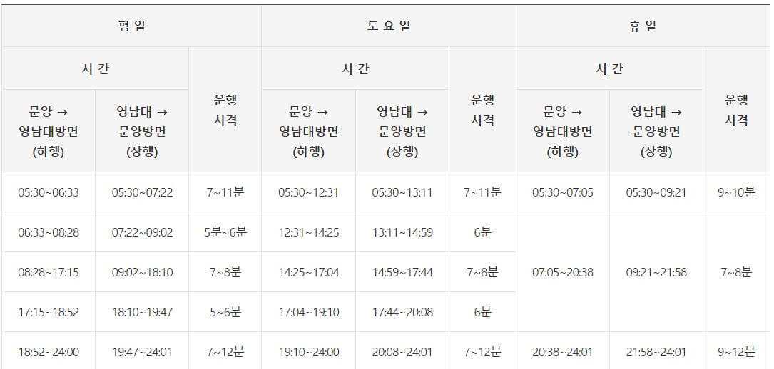 | 반월당 | 05:44 | 05:58 | 23:33 | 23:47 | 0 | 05:42 | 05:57 | 23:33 | 23:45 |