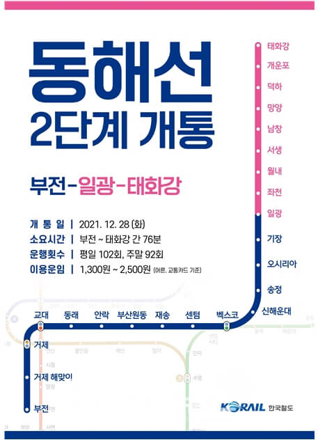 동해선(부산-울산) 복선전철 노선은 2021년 12월 28부터 열차 운행이 시작 되었습니다.