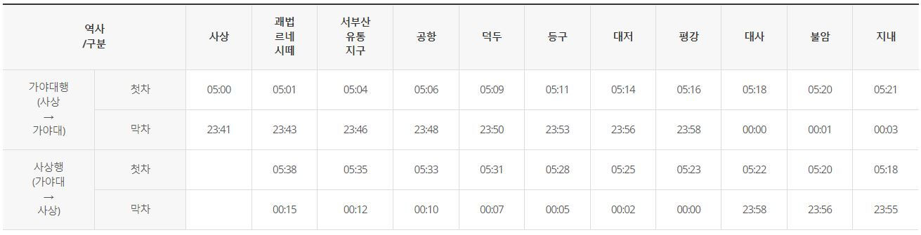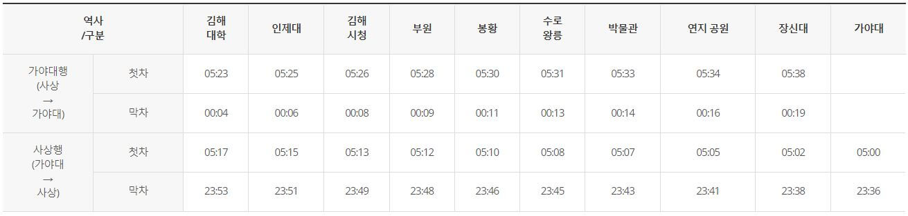 부산-김해 경전철 21개 역사별 첫차/막차 시간표