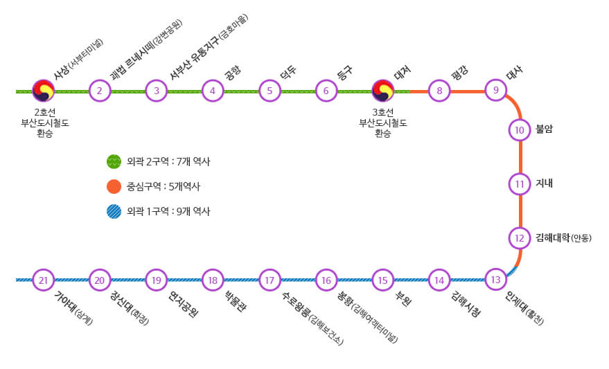김해선은 '가야대역'과 '사상역'을 종점으로 총 21개역 으로 이루어져 있습니다.